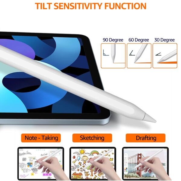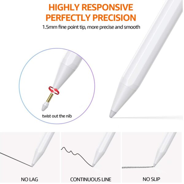 About this item Compatibility:This product can fit various models: iPad 6/7/8/9/10, iPad Pro 11″ (All Generations), iPad Pro 12.9″ (3rd/4th/5th/6th), iPad Mini 6th/5th Gen, and iPad Air 3rd/4th/5th Gen. (Not Compatible with iPhone) Scratch-free palm-rejection: Touch-screen technology with scratch-free palm rejection provides a seamless user experience. Say goodbye to accidental touches and stray marks on your device. Our advanced algorithms differentiate between stylus, fingertip, and palm, ensuring a smooth and natural interaction. Support Angle/Tilt Sensitivity: Tilt sensitivity is a feature that allows the device to recognize the angle at which the stylus is held which makes movements on the device easier. 1.5mm Fine Tip & High Sensitivity:The 1.5mm ultra fine tip offers a smooth and noiseless writing experience, it is perfect for writing, drawing, and detail art work. Magnetic Attraction: The upgraded built-in magnet in the iPad pencil offers stronger attraction than the original Apple Pencil and firmly attaches to the side of the iPad. This enables easy portability and prevents the stylus from slipping or getting lost. Model Confirmation:Go to [Setting>General>About] to confirm your iPad’s model name before placing an order.