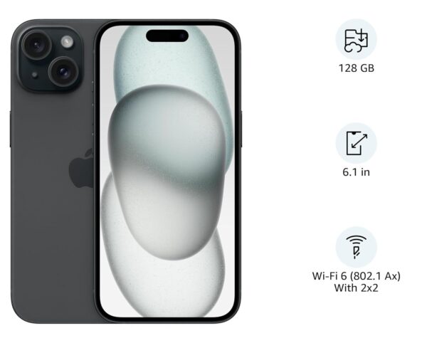About this item DYNAMIC ISLAND COMES TO IPHONE 15 — Dynamic Island bubbles up alerts and Live Activities — so you don’t miss them while you’re doing something else. You can see who’s calling, track your next ride, check your flight status, and so much more. INNOVATIVE DESIGN — iPhone 15 features a durable color-infused glass and aluminum design. It’s splash, water, and dust resistant. The Ceramic Shield front is tougher than any smartphone glass. And the 6.1″ Super Retina XDR display is up to 2x brighter in the sun compared to iPhone 14. 48MP MAIN CAMERA WITH 2X TELEPHOTO — The 48MP Main camera shoots in super-high resolution. So it’s easier than ever to take standout photos with amazing detail. The 2x optical-quality Telephoto lets you frame the perfect close-up. NEXT-GENERATION PORTRAITS — Capture portraits with dramatically more detail and color. Just tap to shift the focus between subjects — even after you take the shot. POWERHOUSE A16 BIONIC CHIP — The superfast chip powers advanced features like computational photography, fluid Dynamic Island transitions, and Voice Isolation for phone calls. And A16 Bionic is incredibly efficient to help deliver great all-day battery life.