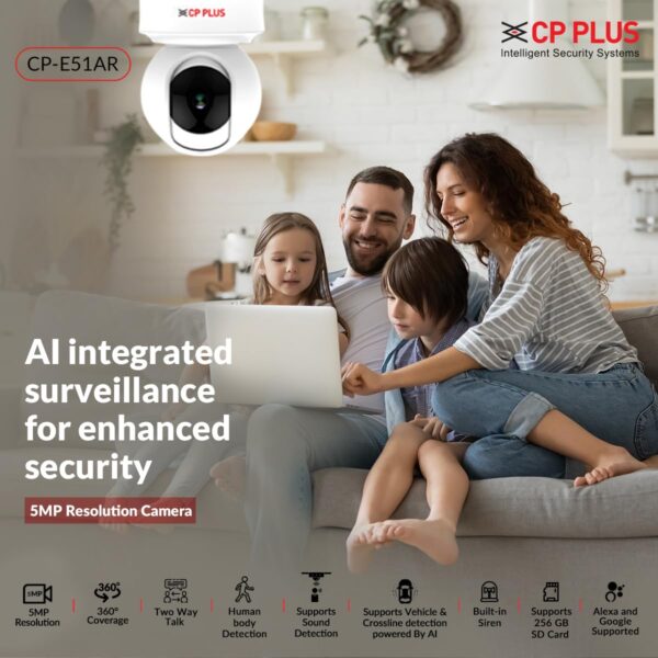• CP PLUS 5 MP Resolution Smart Wi-fi Ai CCTV Camera | 2 Way Talk | Human Body Detection & Motion Tracking Alert | Supports Vehicle & Crossline Detection Powered by Ai | Advanced Night Vision | CP-E51AR