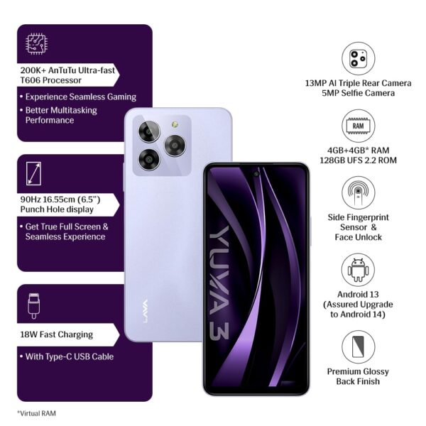 Lava Yuva 3 (Cosmic Lavender, 4+4*GB + 128GB)|Segment’s Most Affordable Smartphone with 128 GB (UFS 2.2) Storage | 90Hz Punch Hole Display|13MP AI Triple Camera|Side Fingerprint Sensor |Bloatware Free
