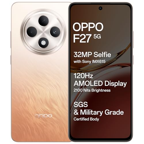 • OPPO F27 5G (Amber Orange, 8GB RAM, 256GB Storage) | 6.67″ FHD+ AMOLED Display|32MP Sony IMX615 Selfie Camera |AI Portrait Expert| 45W SUPERVOOC| with No Cost EMI/Additional Exchange Offers Amazon.in Electronics