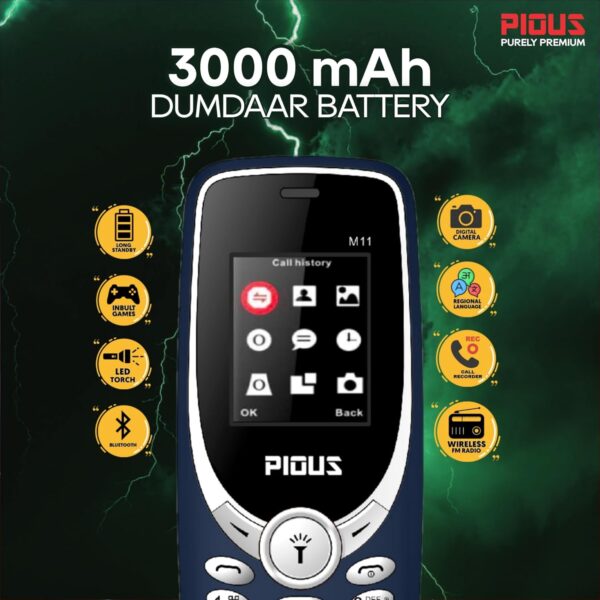 Pious M11 Dual Sim Mobile Phone (1.8 inch Display, Wireless FM Radio, 3000 mAh Battery, Made in India, Blue)