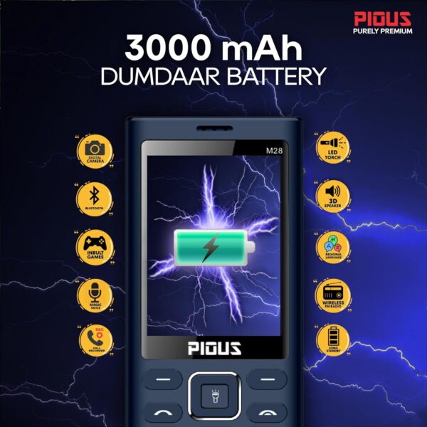 • Pious M28 Dual Sim Keypad Mobile Phone (2.8 Inch Display, Wireless FM Radio, 3000 mAh Big Battery, Made in India, Black)