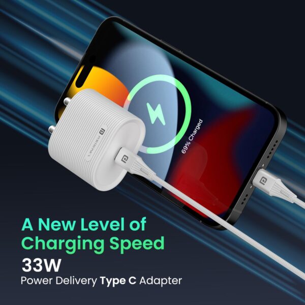 Portronics Adapto 33G 33W GaN Type C PD Port Fast Wall Charger Comes with 60W Nylon Braided Type C to Type C Fast Charging Cable, Compatible with iPhone 8 and Above, iPad, Tablet(White)