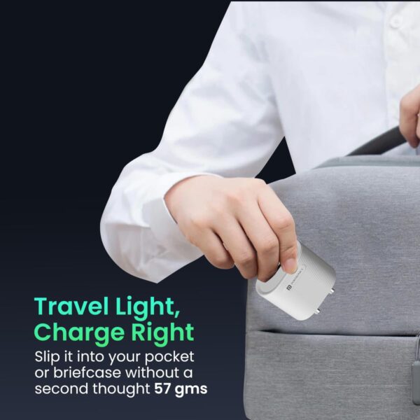 About this item Innovative GaN Charger: Upgrade your charging game with the Adapto 33G Power Adapter from Portronics, This GaN Charger has fast-charging capabilities and can charge devices up to three times faster than traditional chargers. 33W Fast Charging Adapter: The ultimate PD 33W Type C power adapter for lightning-fast charging for all your devices including Android and iOS devices. It can charge your iPhone 15 from 0-60% in just 30 minutes. Comes with Type C Cable: Adapto 33 power adapter comes with a durable 1m Type-C to Type-C cable. It is a complete charging solution for iPhone 15, iPhone 15 Pro, iPhone 15 Plus, and iPhone 15 Pro Max, and other Type C devices. Smallest Portable Charger: This fast mobile charger’s small, lightweight, and elegant design, weighing just 57 grams, makes it the ideal companion for travelers. Its minimalist form effortlessly fits into your bag or carry-on luggage. Wide Compatibility: It is designed to work seamlessly with various fast charging protocols. Delivers the appropriate voltage and power to a wide range of devices like smartphones, tablets, speakers, smartwatches, earbuds, etc. Smart Protection: Adapto 33 features a comprehensive safety system, including built-in short-circuit protection, overload protection, over-temperature protection, and over-voltage protection to keep your devices safe.