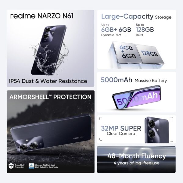 realme NARZO N61 (Marble Black, 4GB RAM+64GB Storage) 90Hz Eye Comfort Display | IP54 Dust & Water Resistance | 48-Month Fluency | Charger in The Box