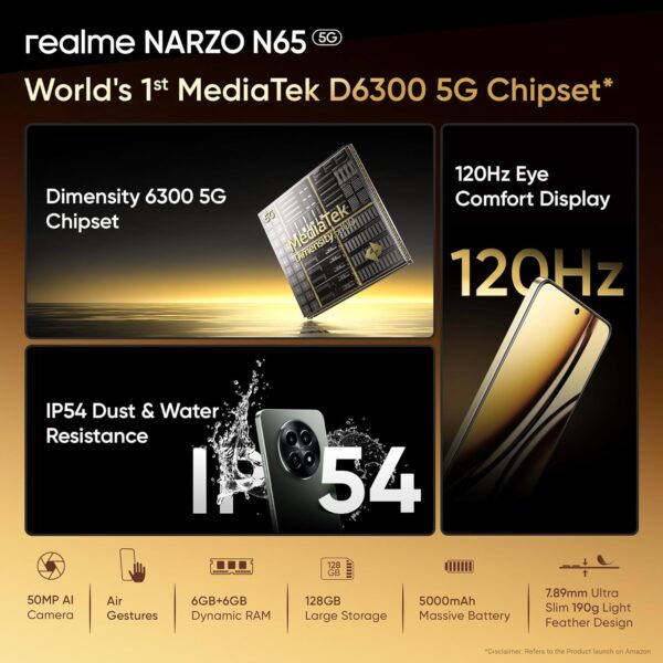 realme NARZO N65 5G (Amber Gold 6GB RAM, 128GB Storage) India’s 1st D6300 5G Chipset | Ultra Slim Design | 120Hz Eye Comfort Display | 50MP AI Camera| Charger in The Box