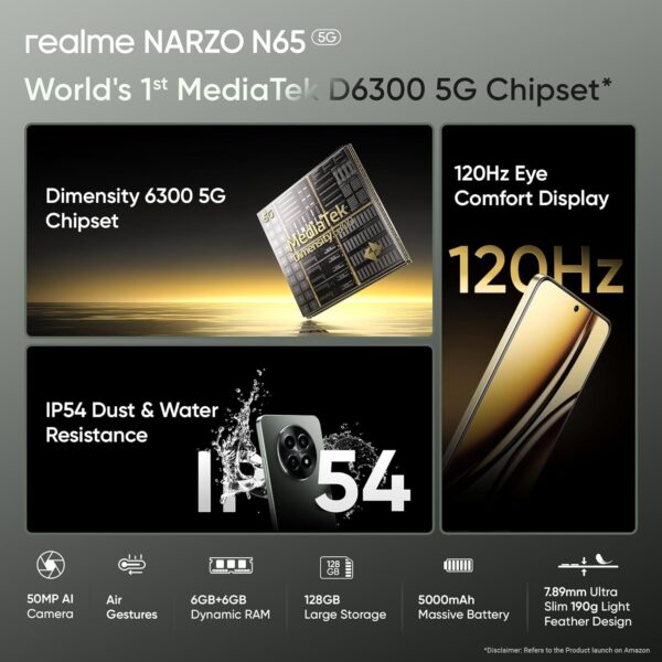 • realme NARZO N65 5G (Deep Green 8GB RAM, 128GB Storage) India’s 1st D6300 5G Chipset | Ultra Slim 190g Design | 120Hz Eye Comfort Display | 50MP AI Camera| Charger in The Box