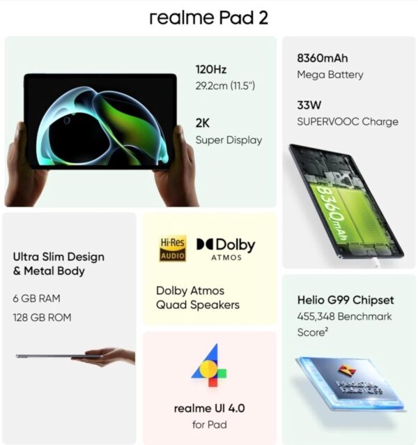 • realme Pad 2 6 GB RAM 128 GB ROM 29.21 CM (11.5 inch) Large Display, 8360mAh Mega Battery, 7.2mm Ultra-Slim Design,MediaTek G99 Processor, 33W SUPERVOOC Charge, Wi-Fi Only Tablet (Inspiration Green)