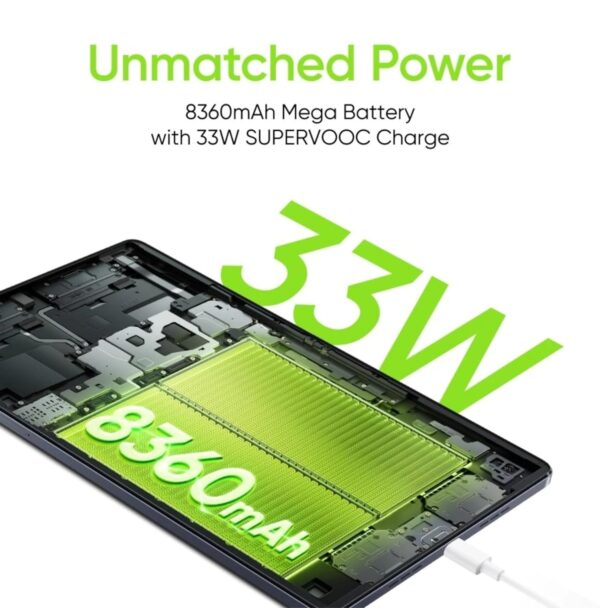 About this item ☆【RAM, ROM And Expandable】:- 6GB RAM || 128GB Internal Storage/ROM || Expandable Upto 2 TB. || Up to 256GB ROM Bigger is Better, Massive storage for all your creative projects. With the segment’s highest ROM, you can store all your favorite photos, videos, apps, and files, with plenty of extra room available for music, movies, and other entertainment. || Up to 16GB Dynamic RAM Powered for Smooth, Massive RAM for massive creation. Multi-task more effortlessly than ever, with 8GB RAM built in. ☆【Display】:-2K Display with upto 120Hz screen refresh rate || 29.2cm (11.5”) 120Hz 2K Display | Size: 29.2cm(11.5”) | Resolution:2000×1200 | Screen-to-body ratio: 85.2% | Color: 1 Billion colors | Sunlight Mode Brightness: 450nits(Peak Brightness) |The segment’s very best display, bringing together the segment’s first ever 120Hz 2K display and the segment’s largest ever size. Experience next level of smooth, with a seamlessly fast refresh rate taking you where you want without lag and stutter. ☆【Processor】:- MediaTek Helio G99 Chipset || CPU: 6nm Octa-core, Maximum frequency 2.2GHz, A76×2 2.2GHz, A55×6 2.0GHz || GPU: Arm Mali G57 || realme UI 4.0 for Pad Based on Android 13 | A true powerhouse chipset to get you reliably smooth performance. Boasting a benchmark score of 455,348 two flagship A76 cores up to 2.2GHz, and advanced 6nm process technology, you get smooth power output with low power consumption, for longer-lasting power built with smooth at the core. ☆【Camera】:- 8 MP Primary Camera | 5 MP Front || [REAR]:- 8MP AI Camera | Aperture: f/2.0 | Lens: 4P | Photography Function: Photo, AI Beauty, Filter, Panoramic View, HDR, Text Scanner | Video Recording: 720p@30fps, 1080p@30fps || [FRONT]:- 5MP Rear Camera | Aperture: f/2.2 | Lens: 3P | Photography Function: Photo, Beauty, Filter, Panoramic View, HDR | Video Recording: 720p@30fps, 1080p@30fps. Resolution :- 3264 x 2448 pixels, 1920 x 1080 pixels, 30 fps. ☆【Battery】:- 8360mAh Battery + 33W Charge || Endless Creation, The segment’s largest battery meets the segment’s fastest charge, for a seamless experience made to be loved. Use your pad with the peace of mind that it was made to last, allowing you to get deeper into your work and entertainment. || 《 Battery Backup 》Videos 》17 Hours | Video Calls 》9 Hours | Readings 》24 Hours | Musics 》190 Hours | Document Processing 》22 Hours. The segment’s largest battery meets the segment’s fastest charge.