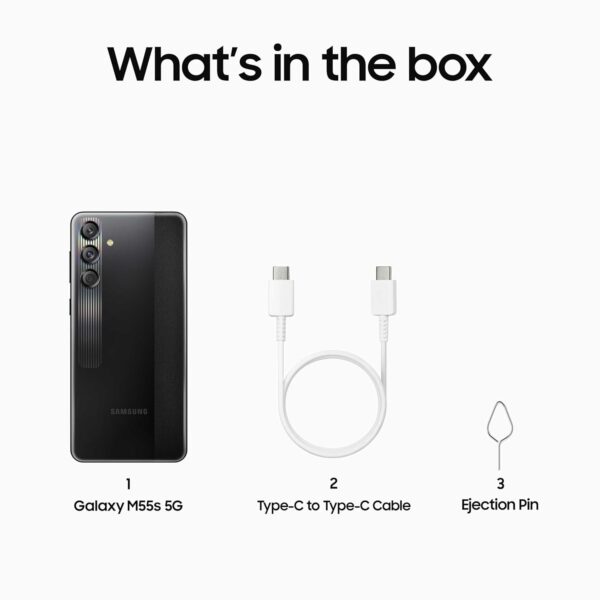 About this item DISPLAY – 16.95 Centimeters (6.7″Inch) Super AMOLED Plus Display with 19.5:9 Aspect Ratio, FHD+ Resolution with 1080 x 2400 Pixels , 394 PPI with 16M Colors and 120Hz Refresh Rate CAMERA – 50MP (F1.8) Main Wide Angle Camera + 8MP (F2.2) Ultra Wide Angle Camera + 2MP (F2.4) Macro Angle Camera | 50MP (F2.4) Front Camera | Video Maximum Resolution of UltraHD 4k (3840 x 2160) @30fps INTERFACE & PROCESSOR – Latest Android 14 Operating System having One UI 6.1 platform with Snapdragon 7 Gen 1 Processor | 2.4GHz, 2.36GHz, 1.8GHz Clock Speed with Octa-Core Processor BATTERY – Get a massive 5000mAh Lithium-ion Battery (Non-Removable) with C-Type Super Fast Charging (45W Charging Support) OS UPDATES & SECURITY – Get upto 4 Generations of AndroidOS Upgrades & 5 Years of Security Updates with Samsung Galaxy M55s. Includes 1 Year Manufacturer Warranty for Device and 6 Months for In-Box Accessories.